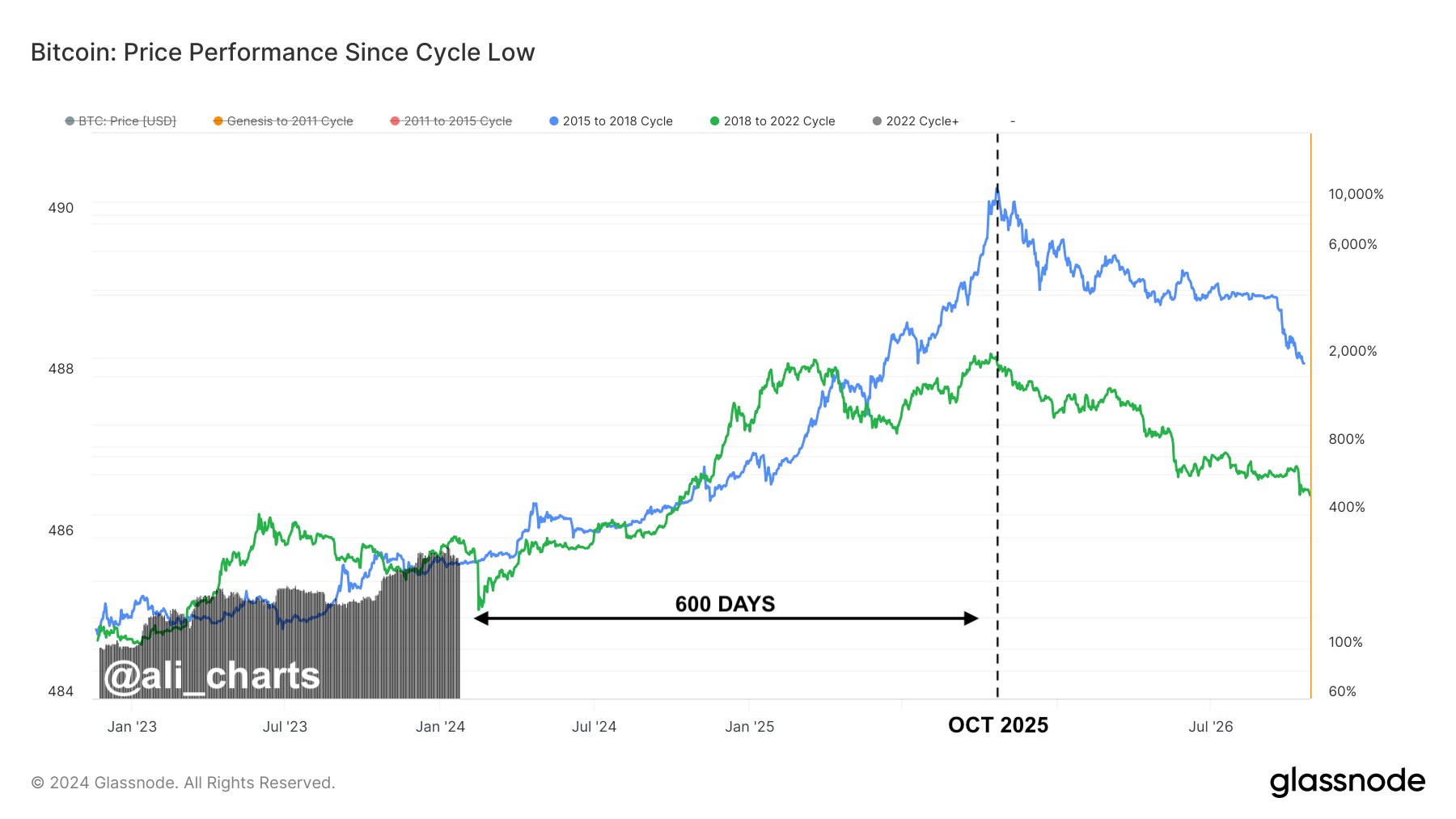 “If Bitcoin mirrors past bull runs (2015-2018 & 2018-2022) from their respective market bottoms, projections suggest the next market peak could land around October 2025,” says Ali. “This implies BTC still has 600 days of bullish momentum ahead!”