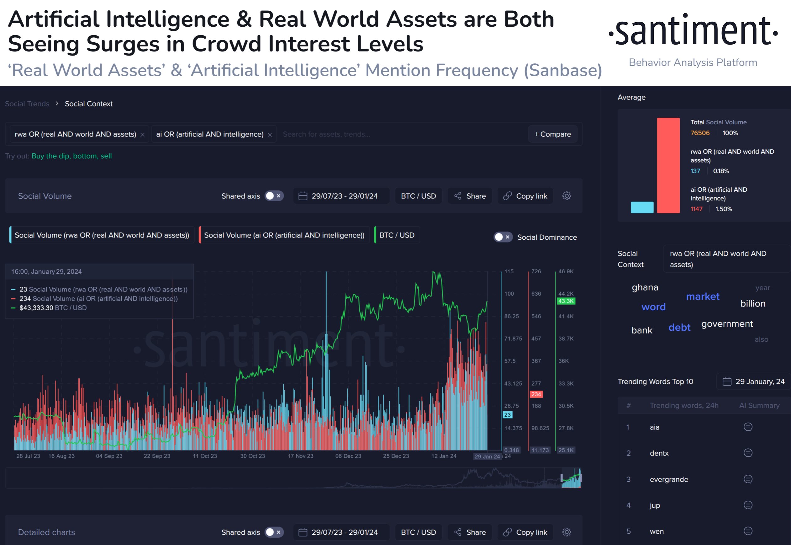 As explained by Santiment in a new post on X, topics like AI and RWA have recently seen a surge in interest. The indicator of relevance here is the “Social Volume,” which keeps track of the amount of discussion related to any given topic or term occurring on social media platforms.