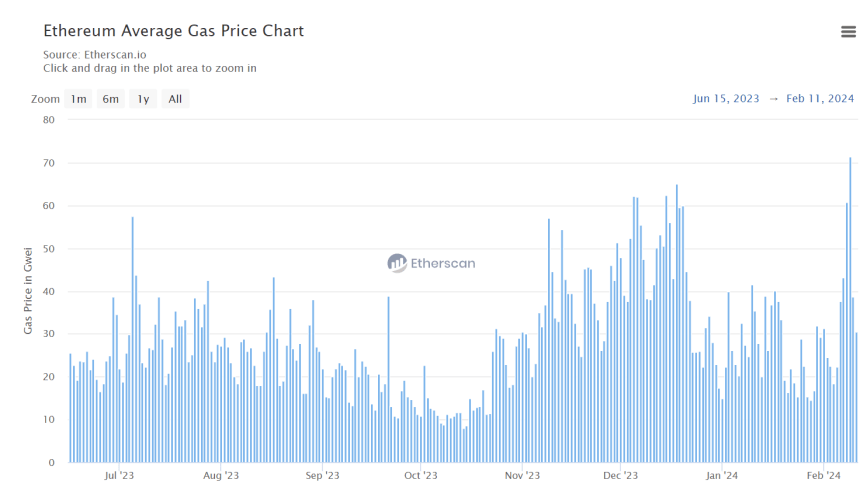 Presently, reports from Etherscan, an Ethereum block explorer and analytics platform, reveal that on Friday, February 9, 2024, Ethereum gas fees reached an average gas price of 71.4 Gwei, with a maximum and minimum gas price of 59,956 Gwei and 34.4 Gwei respectively.