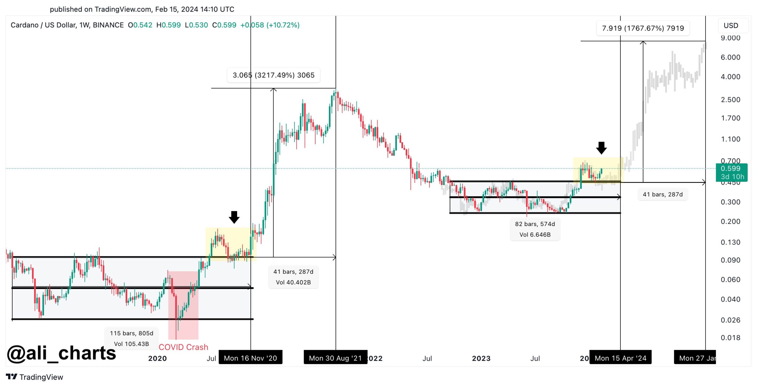 During 2019-2020, Cardano was also stuck in consolidation inside a parallel channel similar to the one witnessed recently, as Ali highlighted in the chart.