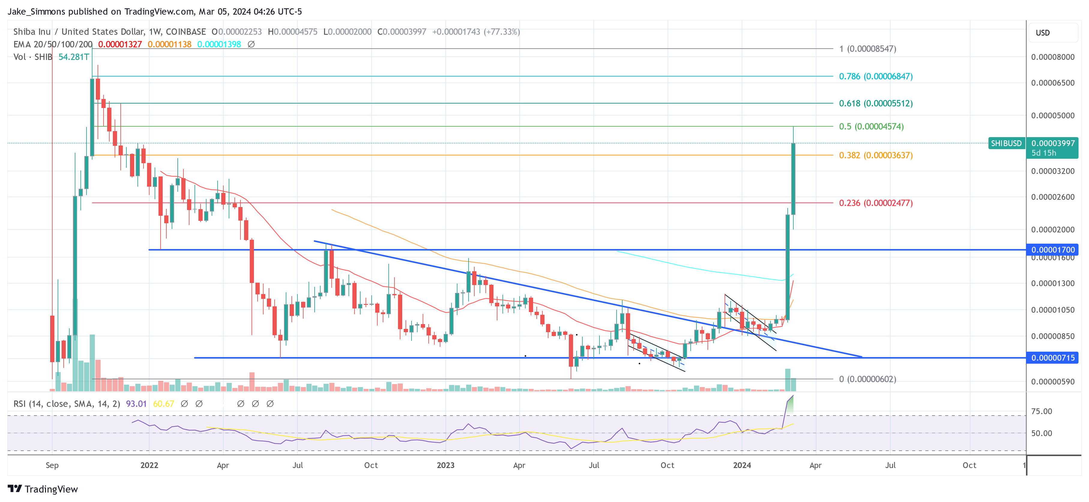 SHIB’s breakthrough past the 20-, 50-, and 100-week Exponential Moving Averages (EMAs) affirmed its strong bullish trend. After surpassing the August 2022 peak of $0.00001791, SHIB’s upward momentum became unstoppable.
