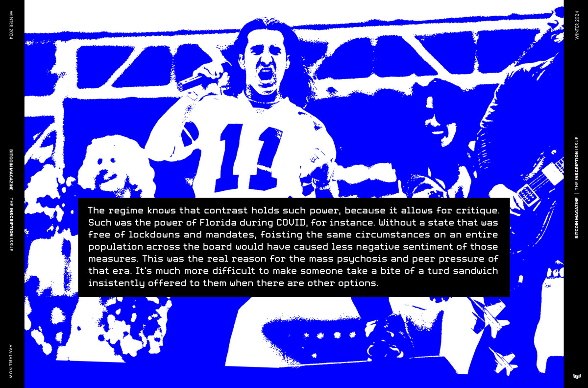 The regime knows that contrast holds such power, because it allows for critique. Such was the power of Florida during COVID, for instance. Without a state that was free of lockdowns and mandates, foisting the same circumstances on an entire population across the board would have caused less negative sentiment of those measures. This was the real reason for the mass psychosis and peer pressure of that era. It’s much more difficult to make someone take a bite of a turd sandwich insistently offered to them when there are other options.