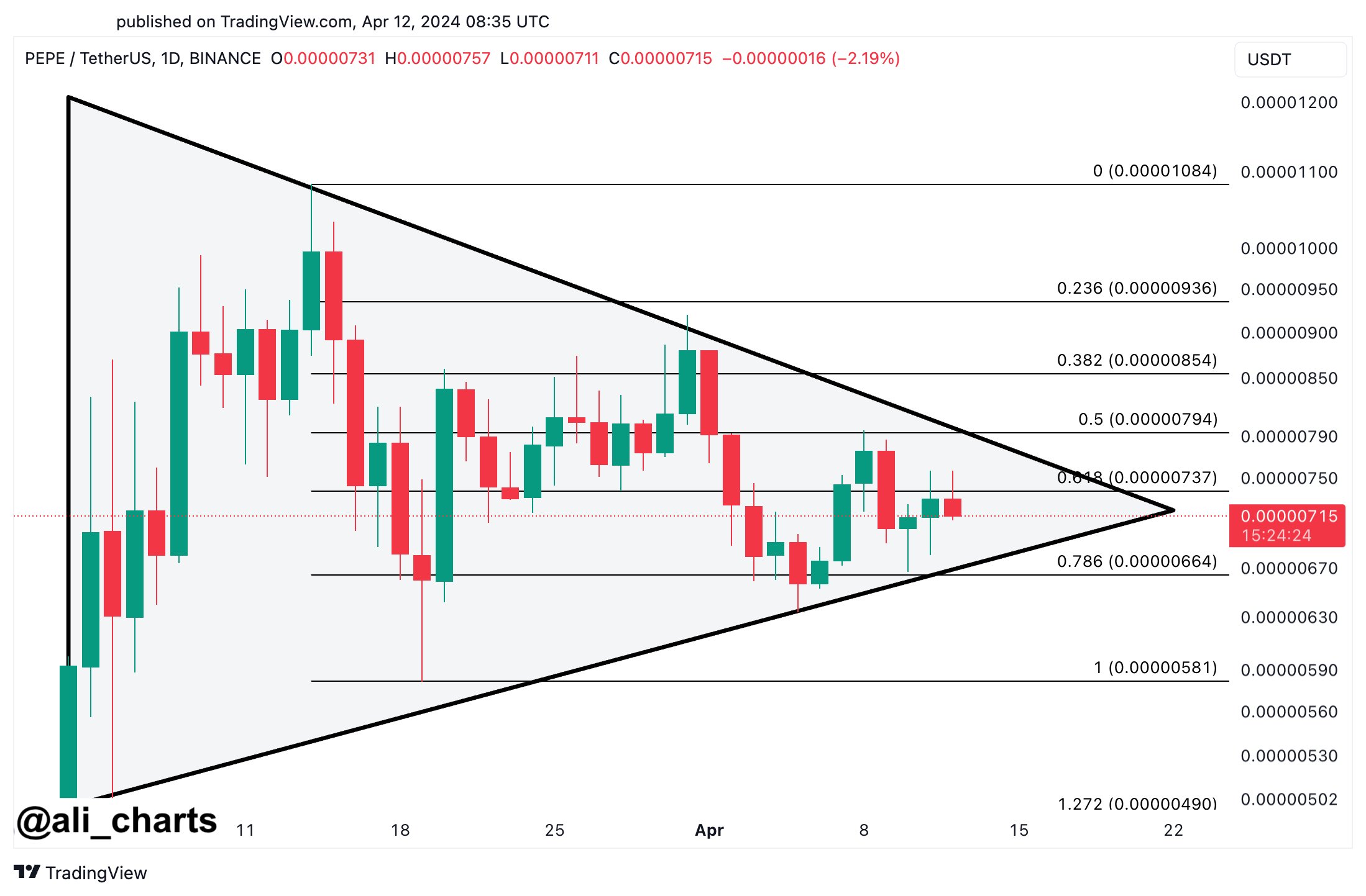Now, here is the chart shared by Ali that highlights the symmetrical triangle pattern that PEPE has been trading inside recently: