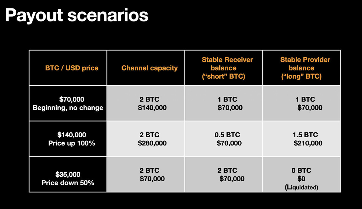 This distinction is critical. Stablecoins usually involve a centralized governing body overseeing a global network, while a stable channel is a localized arrangement where risk is contained to the participants involved. Interestingly, it does not even have to rely on network effects: one user can choose to receive USD-equivalent payments from another, and subsequently shift the stability contract to a different provider at their discretion. Stability provision has the potential to become a staple service from various Lightning Service Provider types of entities competing and offering different rates.