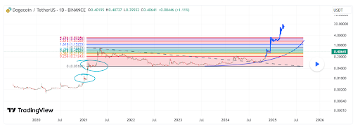 The analyst’s accompanying chart showed that Dogecoin could rally to as high as $20 by next year. Such a parabolic rally would represent a price gain of around 4.900% from its current level. Based on the chart, this price surge could happen sometime between early January 2025 and July.