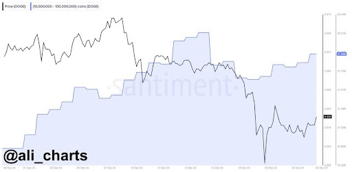 On December 21, the analyst revealed that Dogecoin whales had purchased 250 million DOGE during the recent market dip. This bold move was made as investors saw DOGE’s decline as a favorable entry point, a behavior often associated with more prominent players who buy tokens at a lower price in hopes of long-term gains.