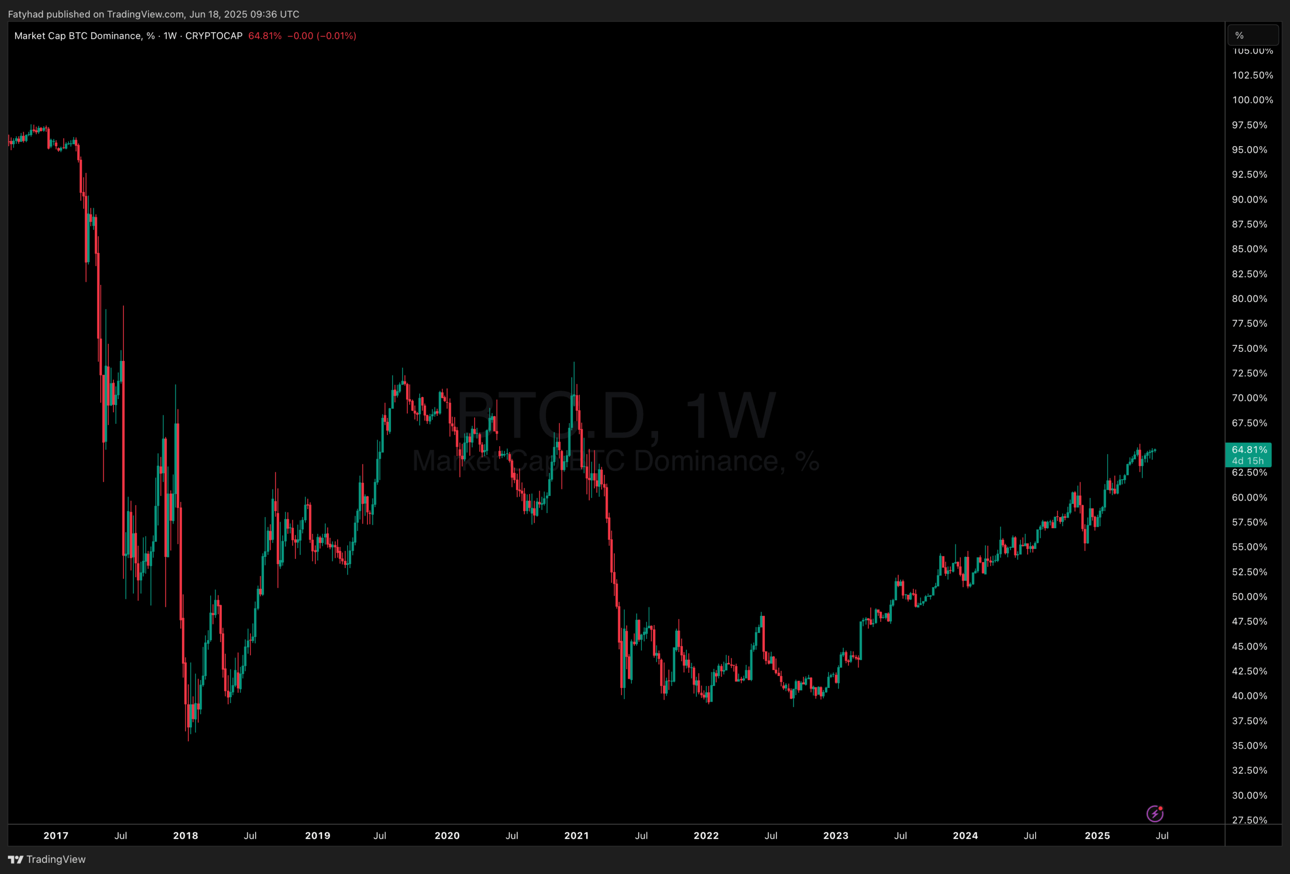 Bitcoin’s grip on the market has remained firm. Its dominance, measured as a percentage of total crypto market capitalization, currently hovers near 63.9% after hitting a high of 65.3% in May.