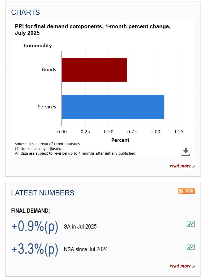Year-over-year CPI is expected at +2.9%, up from +2.7% in July. Core CPI is projected at +3.1%, matching February levels and still well above the Fed’s 2% target. On the wholesale side, PPI is forecast at +3.3% headline and +2.8% core, also trending higher.