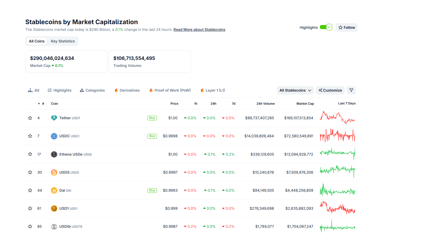 According to Coingecko, the total stablecoin market cap exceeds $290 billion. USDT leads, commanding nearly 50% of the market with over $169 billion in circulation, primarily on Tron and Ethereum. USDC, the second largest, has issued over $72 billion, with a major presence on Solana and Hyperliquid.