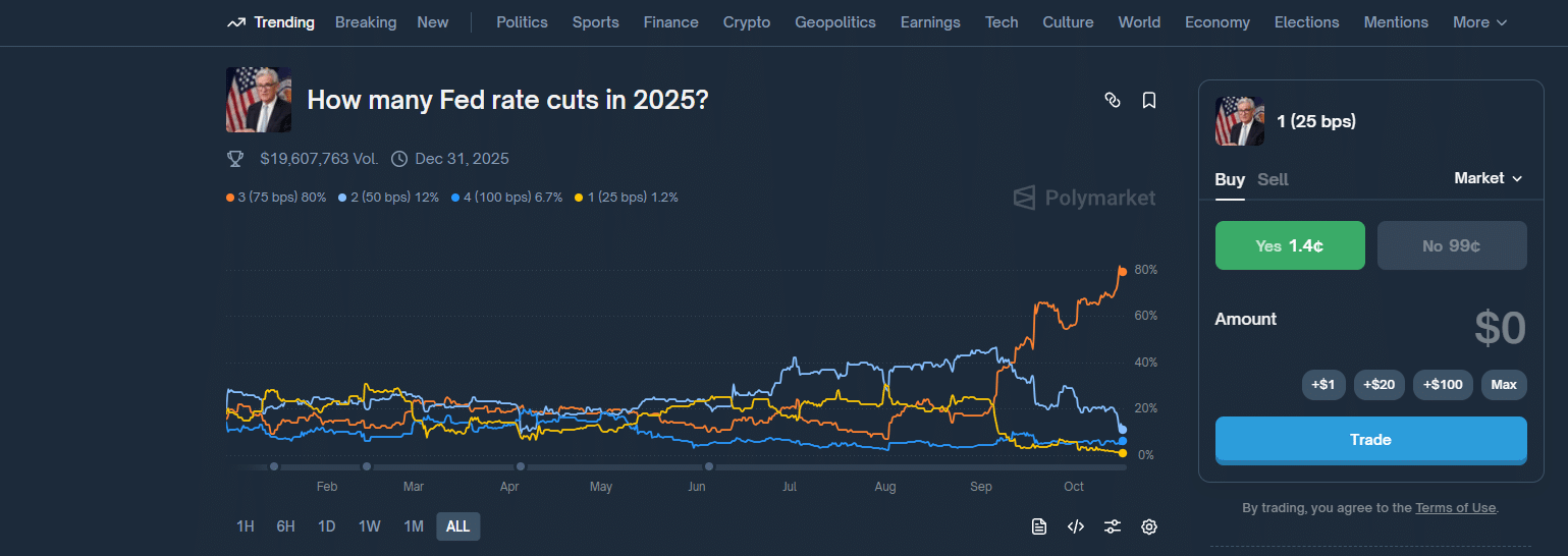 - Meanwhile, gold dips, the dollar index slides, and the Fed tees up another 25 bps cut on October 29.