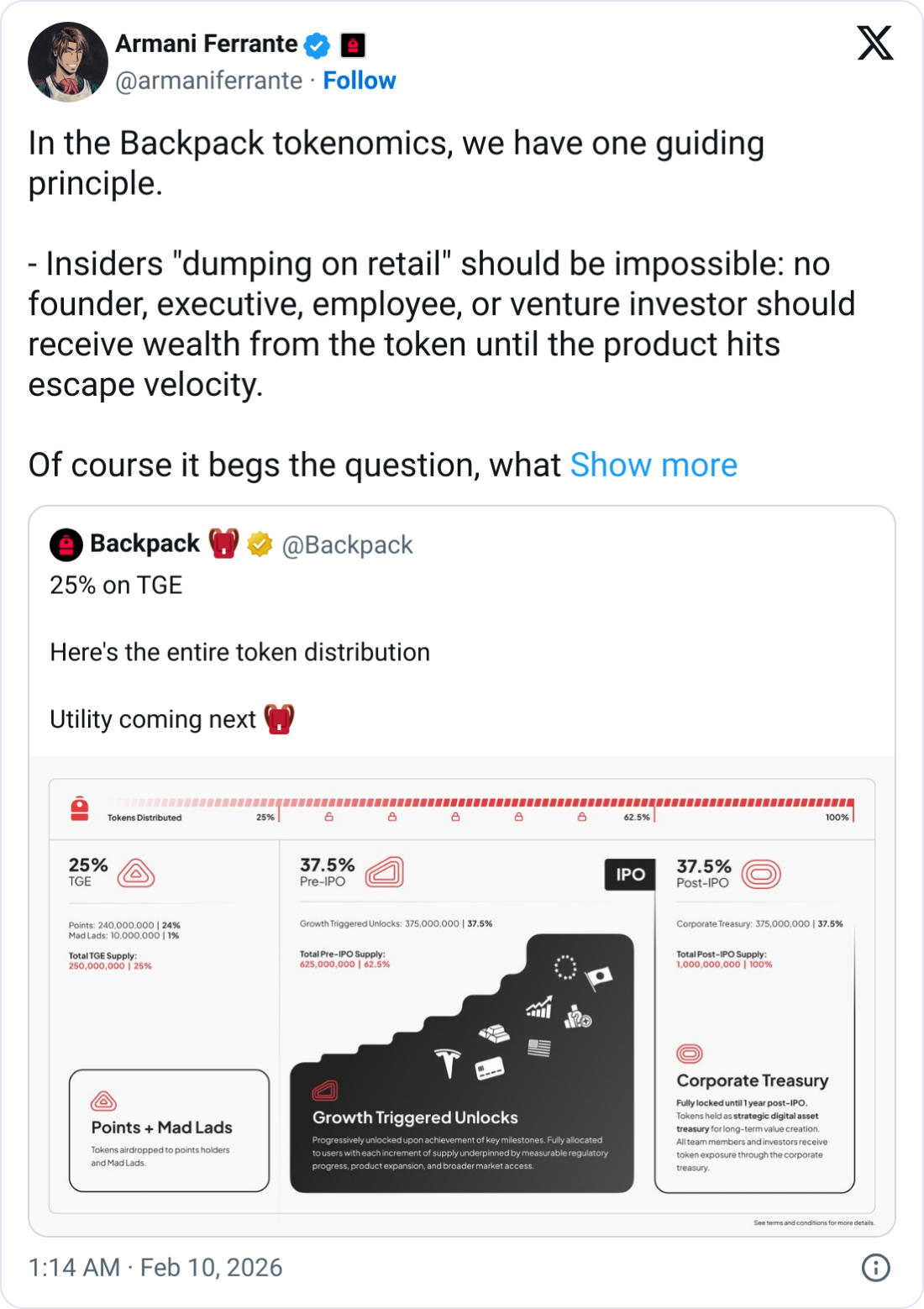 In a separate post, Backpack co-founder and CEO Armani Ferrante wrote on X on Monday that the “guiding principle” for its token unlocks was that “insiders ‘dumping on retail’ should be impossible.”