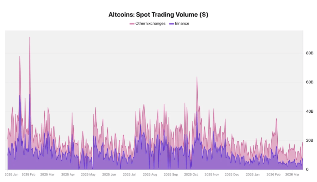 Analysis of altcoin flows shows how much of the remaining altcoin activity is now flowing through Binance compared to the rest of the crypto market. Data from CryptoQuant shows altcoin spot volumes on Binance have collapsed to $7.7 billion, which is a fraction of the $40 billion to $50 billion trading volumes recorded during last year’s peak activity periods.